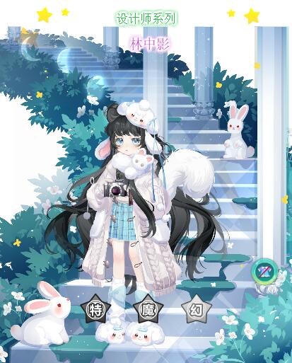 这套时装完美复刻了文艺少女于林间采风的清新画面。白色的针织开衫温柔又软糯,内搭经典的黑色制服上衣,瞬间增添了学院气息。下身搭配的蓝色格子短裙则在静谧的森林色调中跳跃出一抹亮色。最引人注目的细节莫过于手中的相机与周围乖巧的小兔子——是记录光影的旅人,也是与自然生灵为伴的森林精灵。