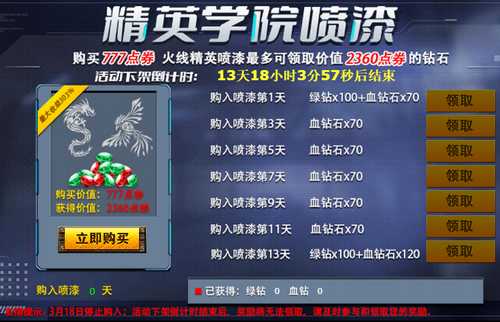 购买价值777点券火线精英的学院喷漆,当天即可领取绿钻石*100,加血钻石*70。