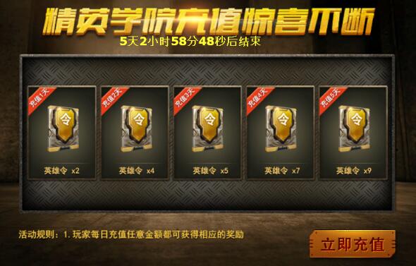 【活动细则】活动期间内充值天数达到条件后即可到主界面领取奖励。充值天数累计5天最多可获得英雄令*27。