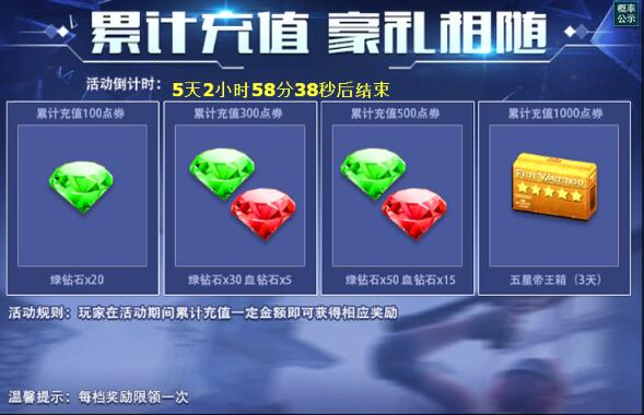 累计充值300点券,可得绿钻石*30,血钻石*5;