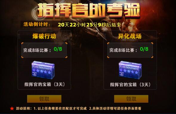 完成8场生化比赛,完成8场爆破比赛即可获得武器箱(指挥官的宝箱 3天)