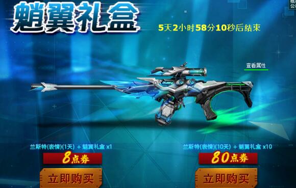 *精英武器箱(3天):打开可获得光曜、灵魂掠夺之刃、AN94-圣卫、尼泊尔-贪狼、XM8-螭龙、幻世-脉冲、破军、Galil-花好月圆其中一把的限时3天武器。