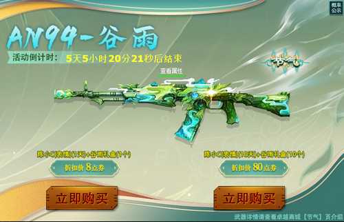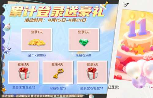 【活动细则】点击“立即购买”即可获得武器“镭射”+600点券,此外累计登录游戏还可以额外获得点券,具体如下: