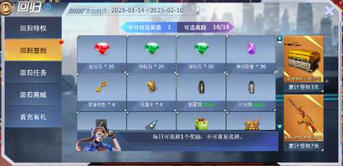 【参与方式】主界面右侧“老兵回归”按钮,选择“回归签到”页面