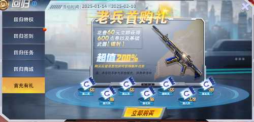 【参与方式】主界面右侧“老兵回归”按钮,选择首充有礼页面