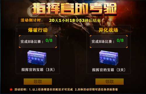 完成8场生化模式比赛,完成8场赏金爆破&经典爆破比赛即可获得武器箱(指挥官的宝箱 3天)