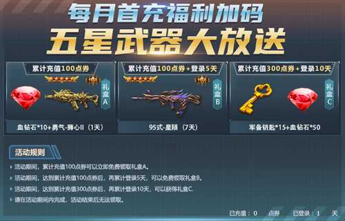 礼盒B领取条件:每月充值额度,首次达到100点券,且登陆天数超过5天即可领取。