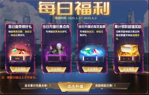【活动细则】每日福利活动限等级20级以上玩家参加。该活动由四个奖励模块组成。每个模块的都有一个“点击领取”按钮。具体奖励和奖励条件如下: