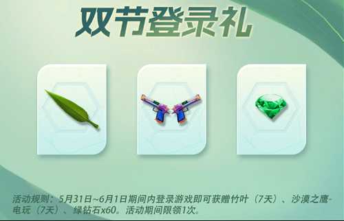 【活动细则】5月31日~6月1日期间登录送竹叶(7天)、沙漠之鹰-电玩(7天)、绿钻石*60