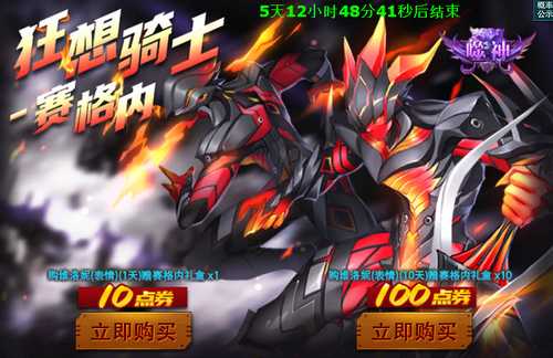 【礼盒内容】狂想骑士-赛格内(1天、3天、7天、30天或者永久)、道具、钻石等。每次打开礼盒都会累计幸运值,幸运值满额时立即获得狂想骑士-赛格内(永久。)