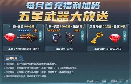 累计充值300点券+登录10天:军备钥匙*15+血钻石*50