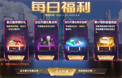 【活动细则】每日福利活动限等级20级以上玩家参加。该活动由四个奖励模块组成。每个模块的都有一个“点击领取”按钮。具体奖励和奖励条件如下:
