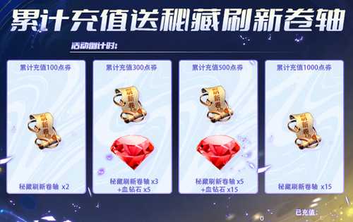 累计充值300点券,可得刷新卷轴*3,血钻石*5;