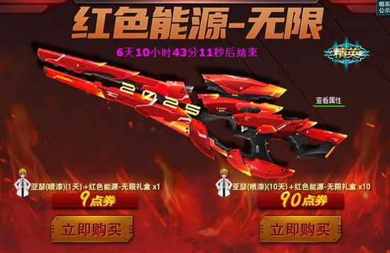 【礼盒内容】打开礼盒可获得红色能源-无限(1天3天7天30天永久)或者弹匣、道具、钻石等。每次打开礼盒都能增加幸运值,幸运值满时立刻获得红色能源-无限(永久)。