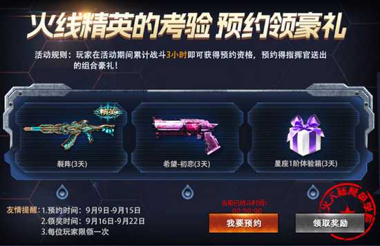 【活动细则】凡是在9月9日~9月15日期间战斗累计3小时点击“我要预约”的玩家即可于9月16日~9月23日期间领取豪礼。