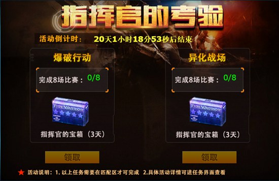 完成8场生化无限火力比赛,完成8场幽灵爆破比赛即可获得武器箱(指挥官的宝箱 3天)