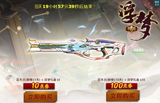 【活动细则】活动期间精彩活动界面可以10点券购买花木兰(表情)(1天)送浮梦礼盒*1,100点券可购买花木兰(表情)(10天)送浮梦礼盒*10