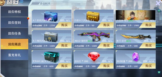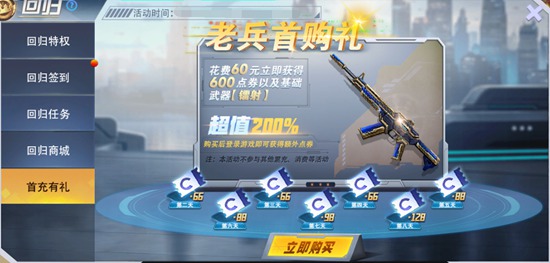 【参与方式】主界面右侧“老兵回归”按钮,选择回归商店页面