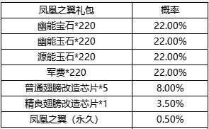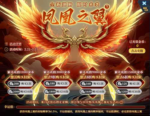 1,活动时间,累计充值达到指定金额,即可参与对应凤凰之翼礼包购买;