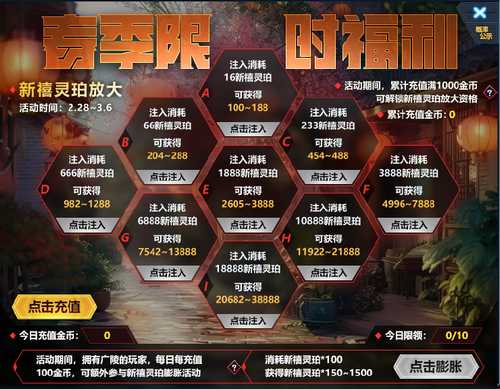 1、活动期间,累计充值满1000金币可解锁新禧灵珀放大资格。