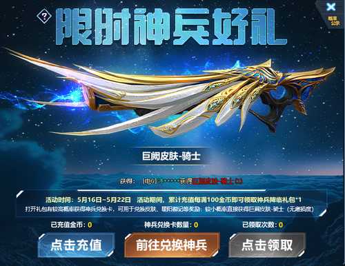 2、打开礼包有较高概率获得神兵兑换卡,可用于兑换皮肤、暖阳徽记等奖励,较小概率直接获得巨阙-骑士;