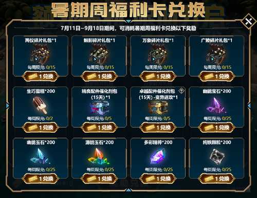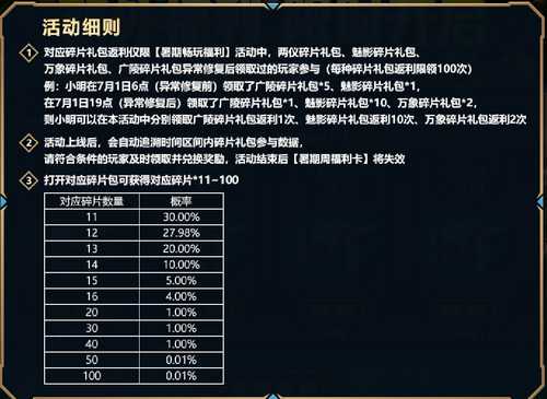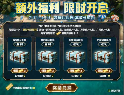 1,7月1日10:30~7月31日23:59:59期间,每领取一次【暑期畅玩福利】中的两仪碎片礼包、魅影碎片礼包、万象碎片礼包、广陵碎片礼包,均可额外领取暑期周福利卡*3;