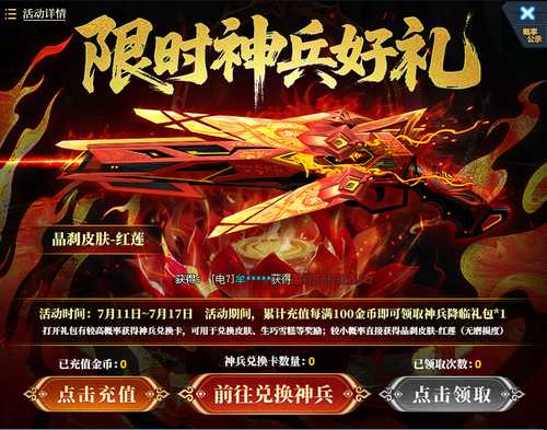 1、活动期间,累计充值每满100金币即可领取神兵降临礼包*1;