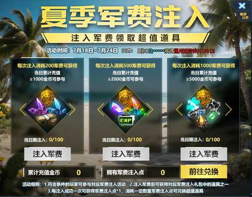 2、注入军费后可获得对应军费注入礼包中的道具之一;