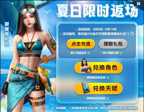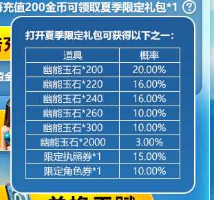 1、活动期间,每充值200金币可领取夏季限定礼包*1。