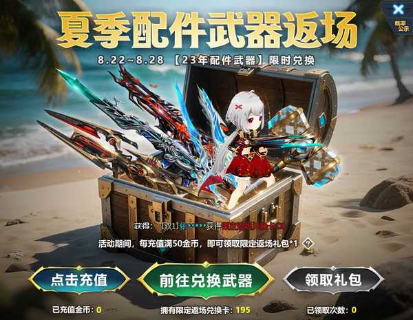 1.活动期间,每充值50金币可领取限定返场礼包*1;