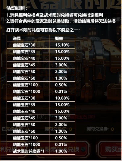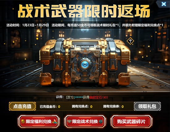 1.活动期间,每充值50金币可领取战术限时礼包*1,并额外附赠限定福利兑换点*1;