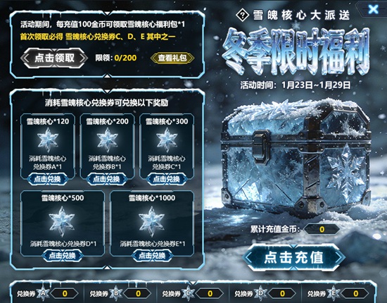1.活动期间,每充值100金币,即可领取雪魄核心福利包*1;