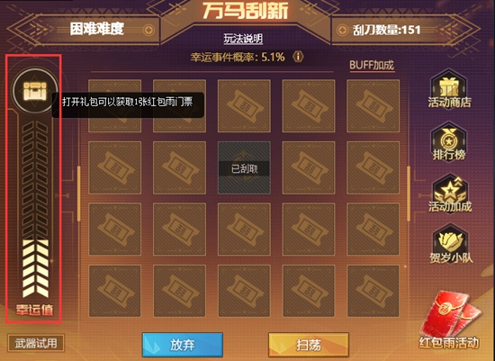 答:购买【万马刮新】活动门票后,可在仓库开启门票礼包,礼包内包含“红包雨加成点数”,当左侧幸运值满值时可获得红包雨门票。