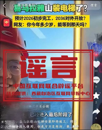 详情:近日,网络上频繁流传关于“珠峰安装电梯”“喜马拉雅山装电梯了?”等信息。对此西藏相关部门回应称,目前珠峰暂无安装电梯计划,网传图文视频为AI生成的虚假信息。部分营销号利用AI伪造西藏各类打卡景点的虚假图文视频,用虚假话术吸引流量、诱导消费,这些信息以“逼真画面+误导性表述”混淆视听,不仅会误导公众认知,还会严重扰乱清朗网络环境。对此,网信部门提醒:对编造散布谣言、扰乱公共秩序、造成恶劣社会影响的行为,公安机关将依法严肃查处。请广大网民不造谣、不信谣、不传谣,切勿轻信或传播非正规来源、未经证实的信息,一切以官方发布为准。(来源:“西藏举报”微信公众号)