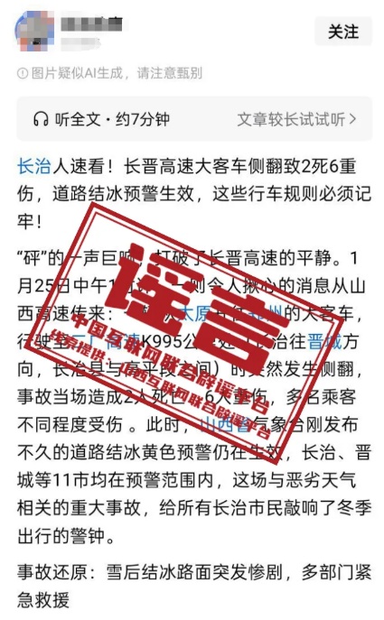 辟 谣 网传“长晋高速大客车侧翻致2死6重伤”系谣言