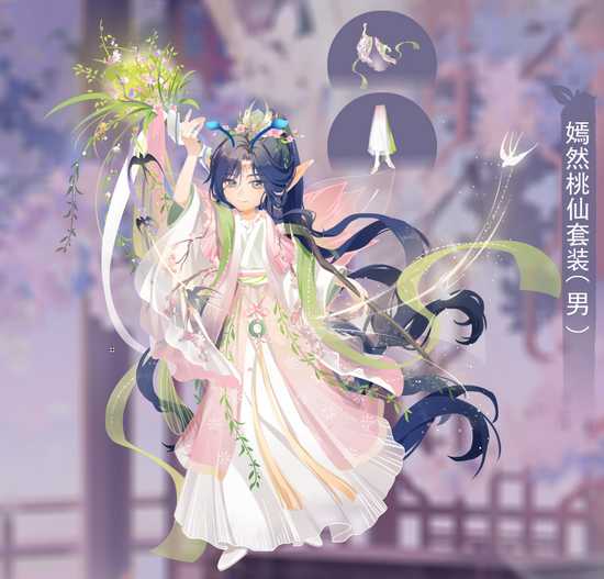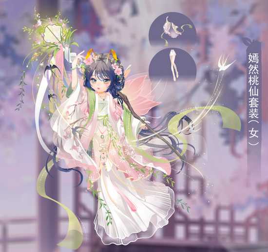 集齐嫣然桃仙套装可获得对应面妆及称号:嫣然桃仙、桃仙外套、桃仙下装、无花无酒背景秀装饰