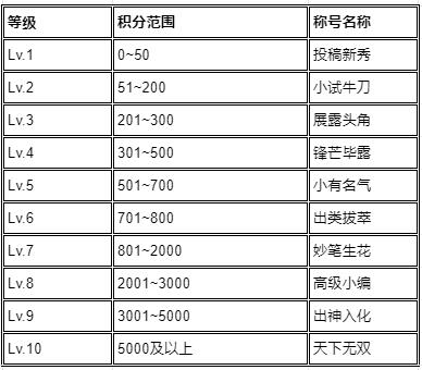 大家为造梦无双所做的贡献会以积分称号的形式显示出来哦!随着积分的升高,你的称号等级也会随着提升。并且在玩家小编排行榜中也会依照你积分的高低来进行排名。头衔展示如下: