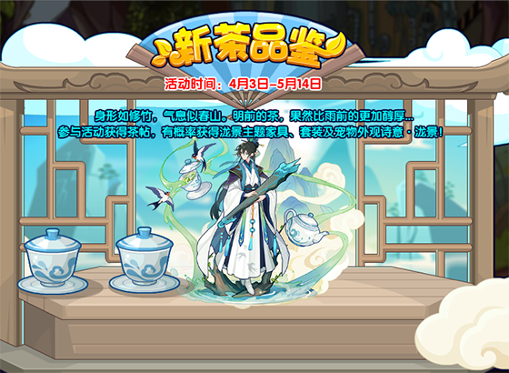 参与活动获得茶帖,有概率获得泷景主题家具、套装及宠物外观诗意·泷景!