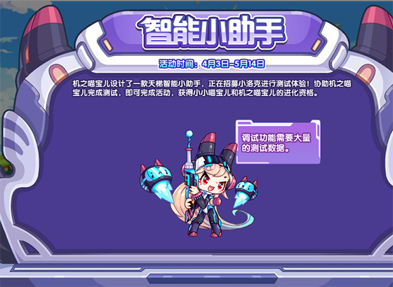 机之喵宝儿设计了一款天梯智能小助手,正在招募小洛克进行测试体验!协助机之喵宝儿完成测试,即可完成活动,获得小小喵宝儿和机之喵宝儿的进化资格。