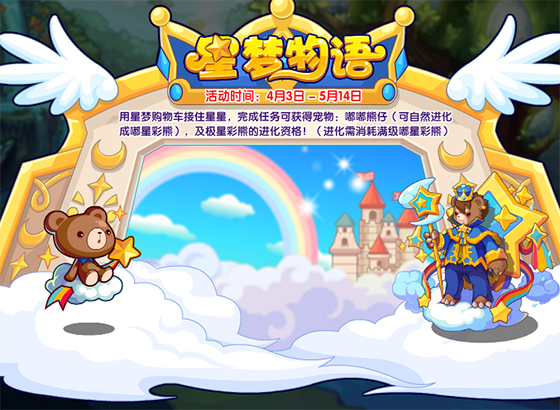 用星梦购物车接住星星,完成任务可获得宠物:嘟嘟熊仔(可自然进化成嘟星彩熊),及极星彩熊的进化资格!(进化需消耗满级嘟星彩熊)