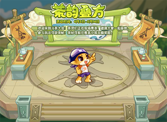 欢迎来到斗茶大会!茶灵们正在现场煮茶,邀请大家一起品尝。参与玩法可获取茶帖!茶帖可前往雅茗小筑兑换奖励。