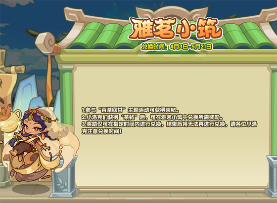 参与“百茶回甘”主题活动可获得茶帖。小洛克们获得“茶帖”后,可在雅茗小筑中兑换所需奖励。奖励仅可在指定时间内进行兑换,结束后将无法再进行兑换,请各位小洛克注意兑换时间!
