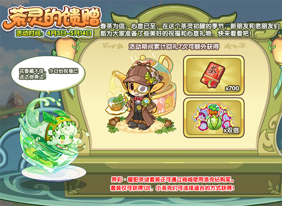 活动获得:茶灵·西塔尔(外观),宠物,套装,培养道具、礼遇契约等
