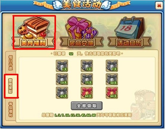 注:当你满足等级条件后,你可以打开右上角的“美食福利”,选择“登陆奖励”领取礼包。