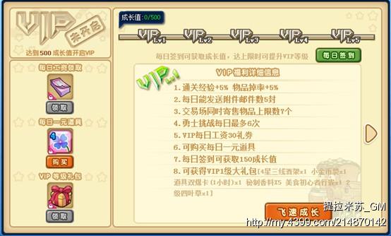 3) 每日VIP签到玩家每天登陆签到可以获得VIP成长值,到达VIP1级以上就可以领取每日工资,获得购买每日一元超值道具的资格,更有VIP等级礼包可以拿。